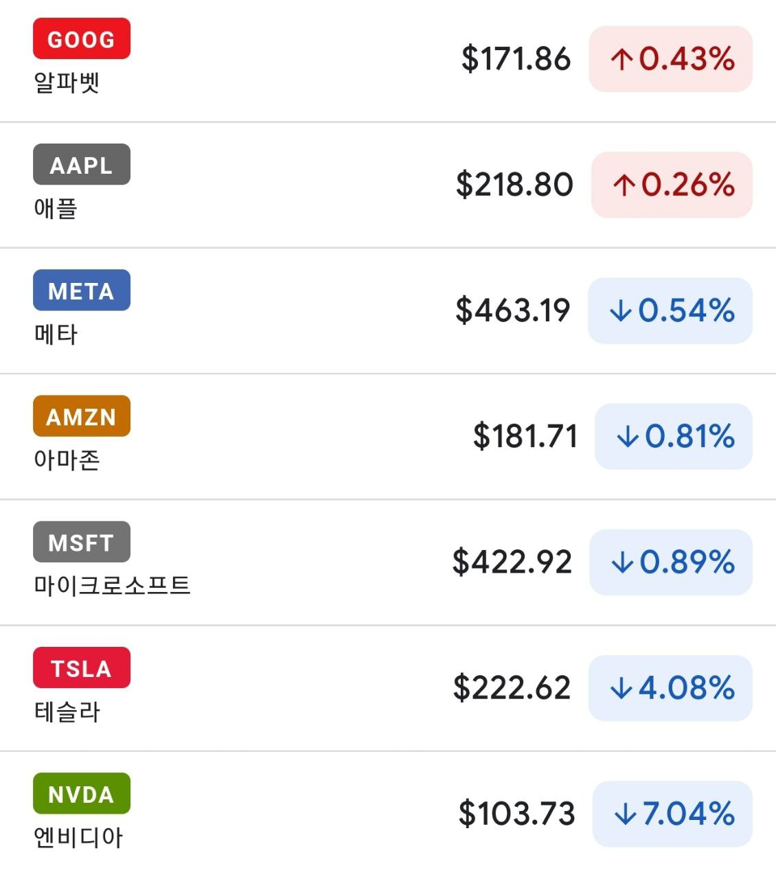 - 특히 엔비디아 -7%, 테슬라 -4% 급락하며 영향