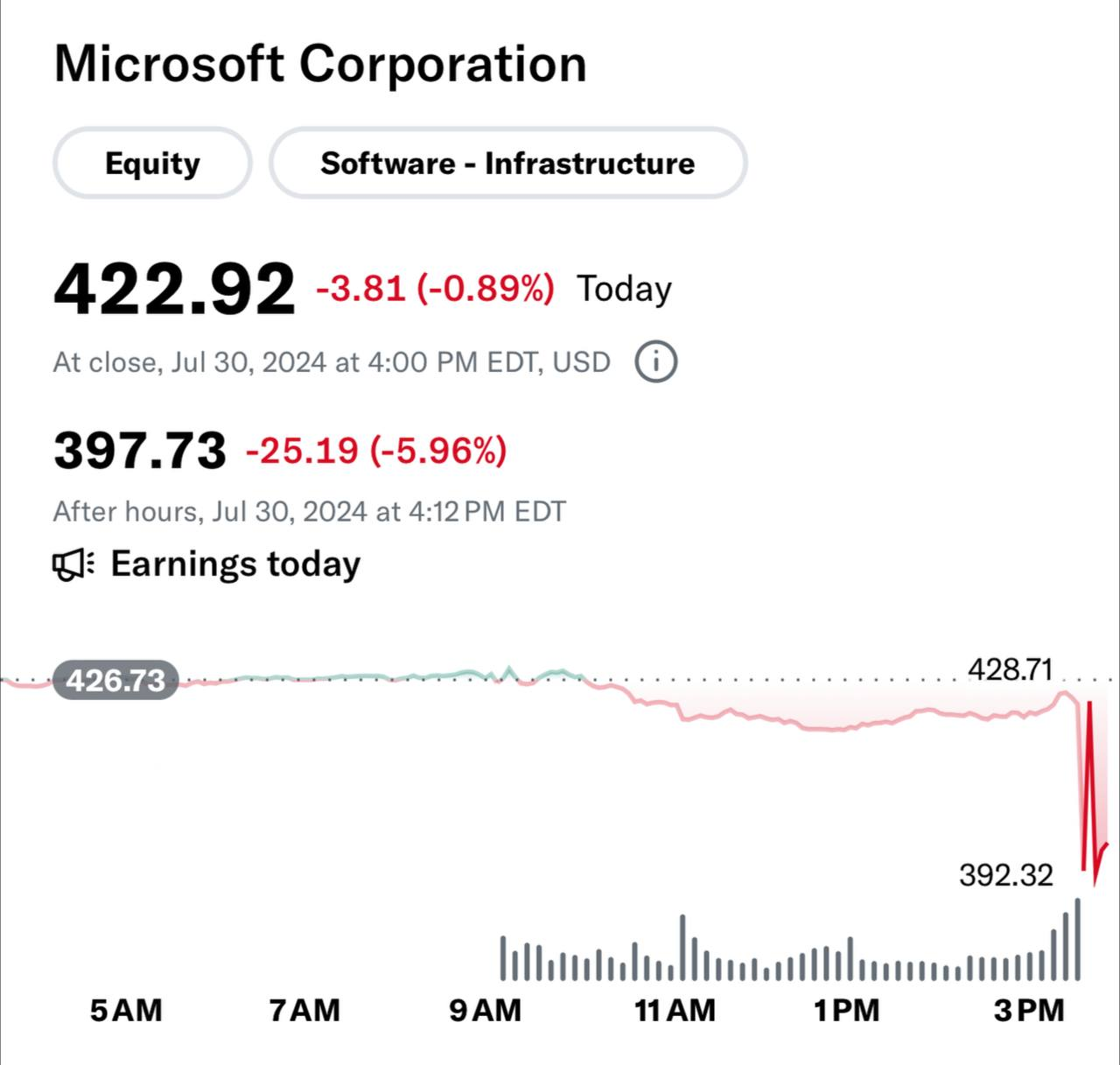 - Microsoft의 주가는 실적 발표 후 약 7% 하락 - 전체 실적