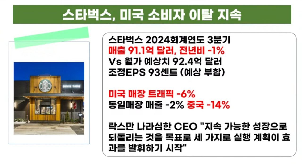 - 장 마감 후 실적 발표에서 스타벅스(+0.99%)는 예상보다 부진한 매출과 동일 매장 판매가 예상을 하회했지만, 기대치가 낮았던 점을 감안 시간 외 2% 내외 상승.