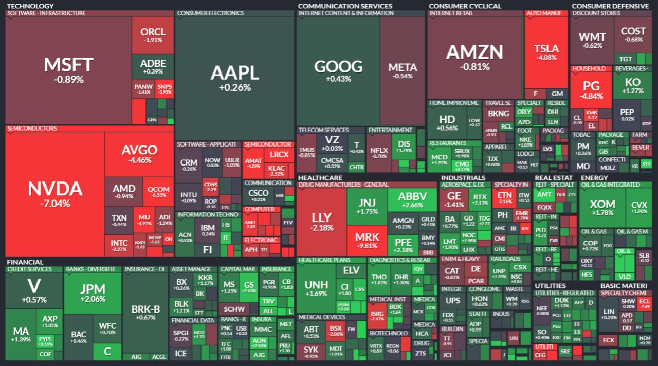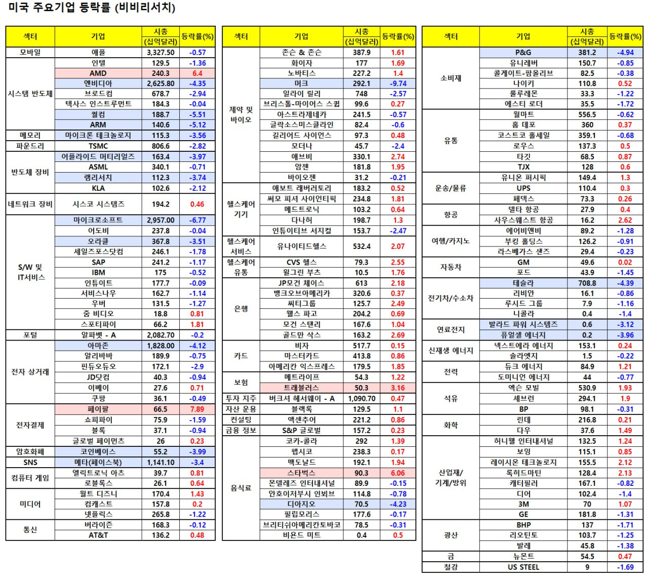 - 애플, 아마존, 메타 플랫폼스, 알파벳A 등 빅테크 주식들은 보합세에 머물렀으며 테슬라는 4.1% 하락 마감. 올해 크게 상승한 엔비디아는 7% 이상 급락 마감하며 반도체 주식의 약세를 주도함.