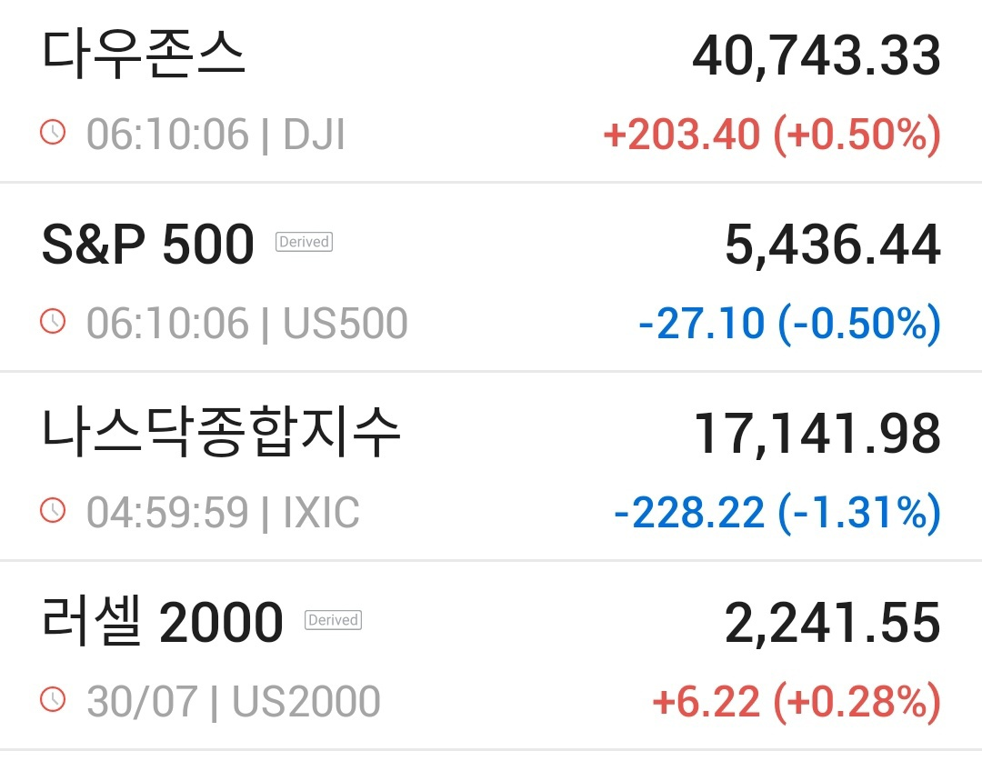 - 화요일 미국 증시는 빅테크 기업들의 실적 발표를 앞두고 나스닥은 1.3% 하락하며 약세를 보인 반면 연준의 9월 금리 인하 전망이 강화되며 금융주가 강세를 보이면서 다우지수는 강세를 보이는 상반된 움직임을 보임.