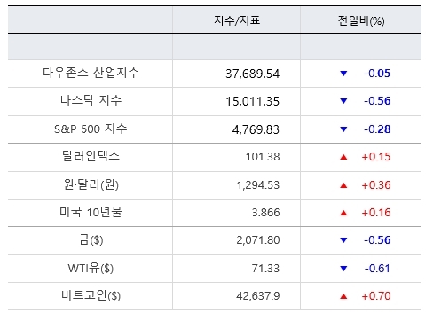 - *다우 -0.05%, 나스닥 -0.56%, S&P500 -0.28%, 러셀2000 -1.52%