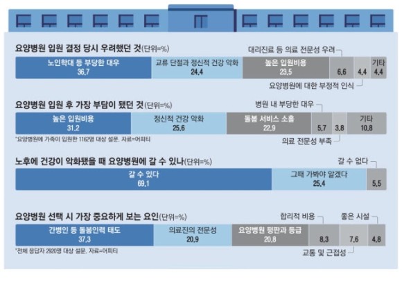2. 국민 10명 중 8명 ‘요양병원 못미더워’... ‘그러나 대안이 없다’ → 인식조사에서 ▷‘불안하지만 전문 인력이 있는 곳’ 46.2% ▷‘믿고 맡기기에 부족하지만 대안이 없다’ 32.3... 응답. 매경 2920명 인식 조사. 가족을 입원시킨 경험이 있는 1162명 가운데 입원 후 가장 부담이 됐던건 ▷높은 입원비용(31.2%), ▷정신적 건겅악화(25.6%) 꼽아...(매경, 요양병원 대해부)▼