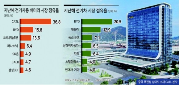6. 지난해 전기차 배터리 시장 점유율 → 세계 10위권 업체 중 CATL(1위), BYD(2위) 등 중국 업체 6개사, 점유율 63.5%. 한국 3사(LG에너지솔루션, SK온, 삼성SDI)는 23.1%... 비(非) 중국 시장에서 LG에너지솔루션이 1위를 지켰지만 2위 CATL(27.5%)과의 차이는 7.1%포인트에서 단 0.3%포인트로 좁혀져.(헤럴드경제)▼