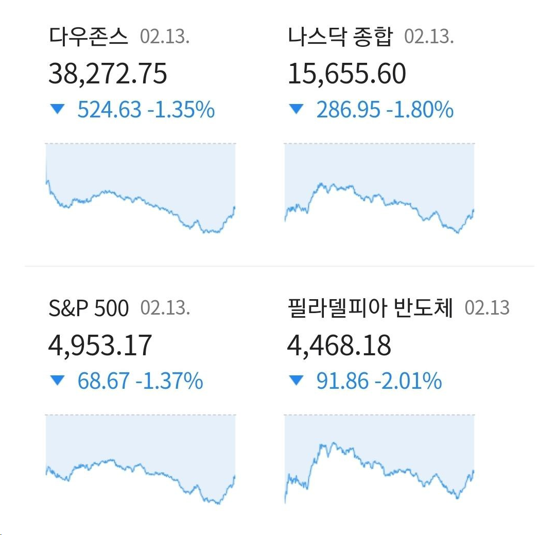 - 예상보다 강한 1월 CPI 데이터가 매도심리를 자극하며 화요일 미국 증시는 큰 폭의 하락세로 마감함.