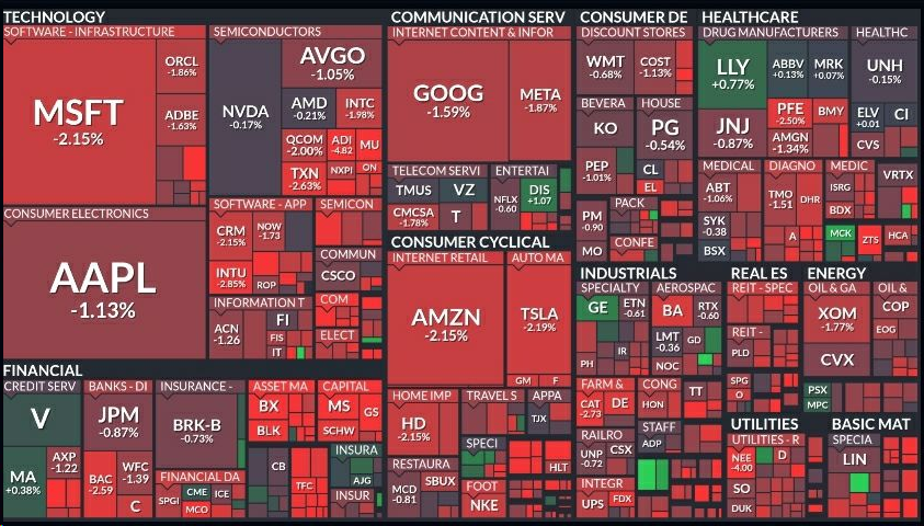 - S&P 500 지수를 구성하는 11개 주요 섹터 모두 평균 1~2% 하락을 기록.