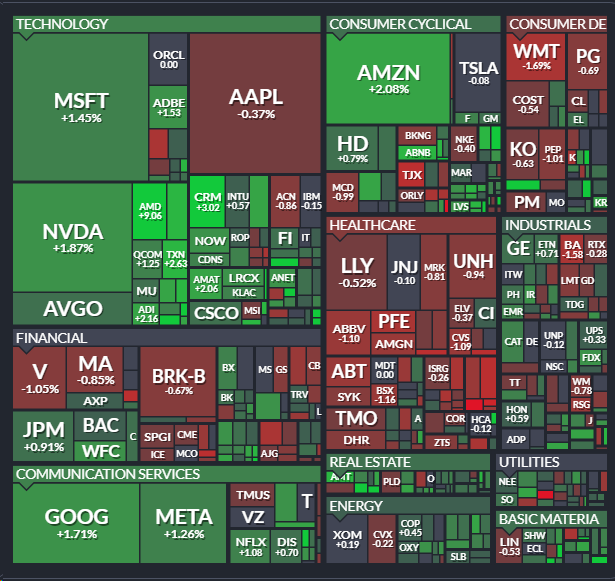 - AI, 반도체 업종 강세 엔비디아(+1.87%)는 AI 산업에 대한 기대와 예상에 부합된 물가지표 발표 후 상승.