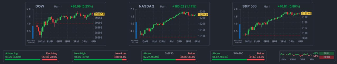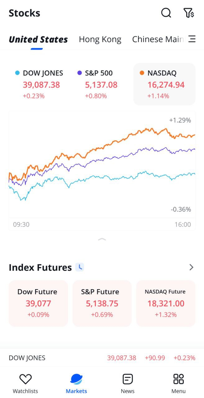 - 미국 증시는 3대 지수 모두 상승했으며, 나스닥은 장중 최고치를 기록하기도 하며 1.1% 상승 마감.