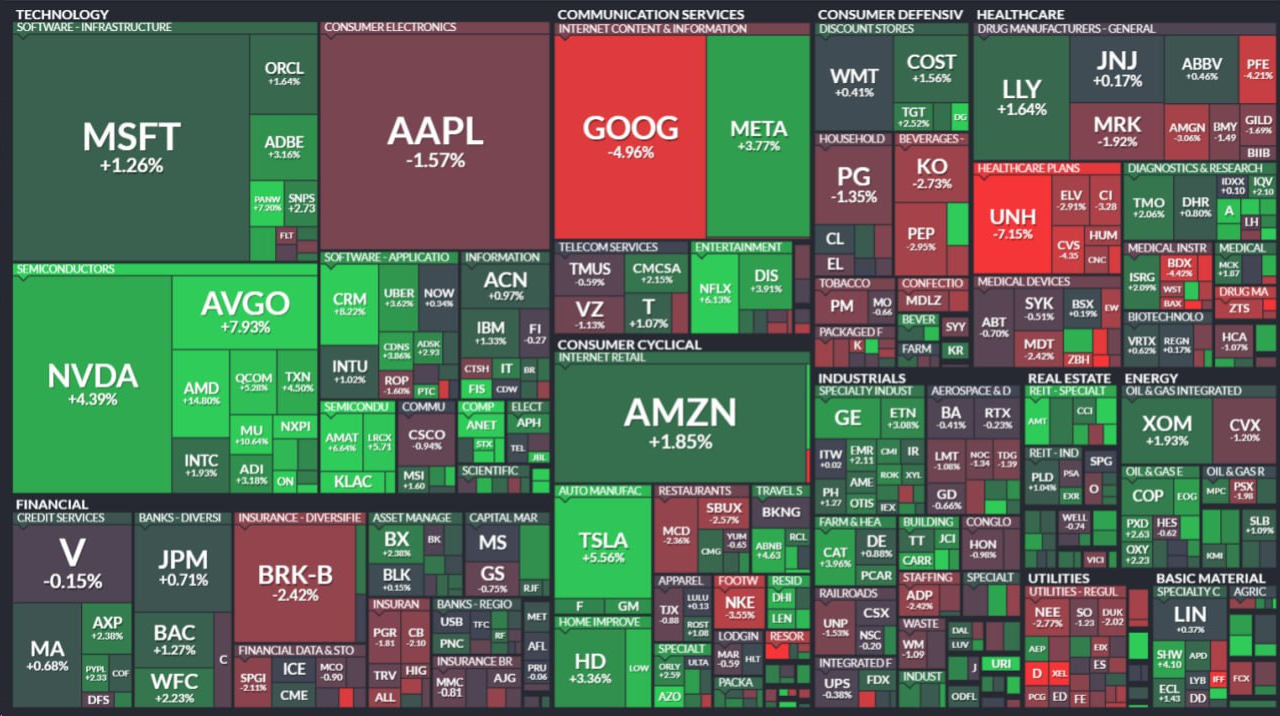 - 반도체 기업 엔비디아는 이날 4% 상승하며 기술 섹터의 랠리를 주도했고 메타도 2% 이상 급등.