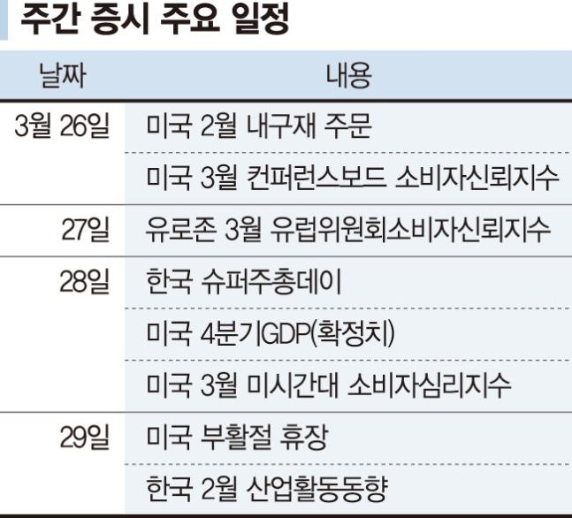- 이번 주 뉴욕 증시는 미국 2월 개인소비지출(PCE) 가격지수와 작년 4분기 미국 국내총생산(GDP) 확정치 등에 주목할 것으로 보인다.