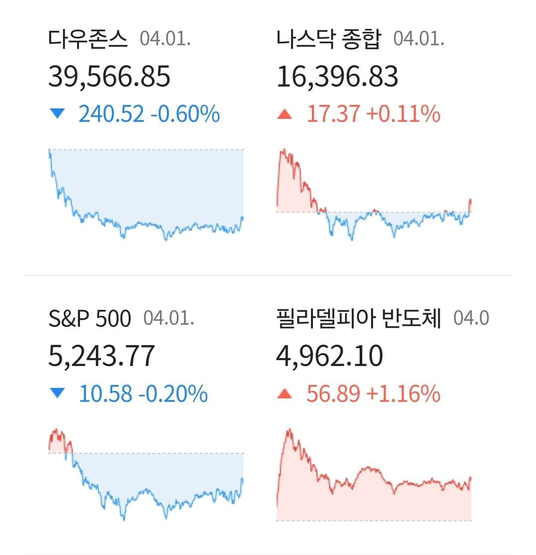 - 월요일 미국 증시는 예상보다 강한 제조업 데이터로 인해 국채 수익률이 상승한 후 연준의 6월 금리 인하 전망이 약화되면서 전반적인 하락세를 시현함.