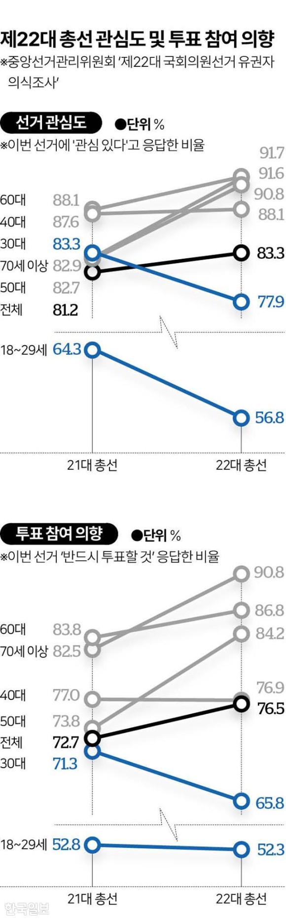 1. 찍을 곳 없다. 2030 투표의향 하락 → 선관위 조사, 이번 총선에 반드시 투표하겠다 ‘76.5%’... 역대최고. 모든 연령층에서 늘었지만 18세~29세(64.3→56.8%), 30대(83.3→ 77.9%)만 투표 의향 줄어.(한국)▼