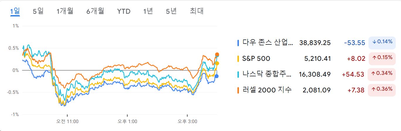 - 다우지수는 소폭하락, S%P 500과 나스닥은 상승했지만 모두 소폭의 움직임만 보임.