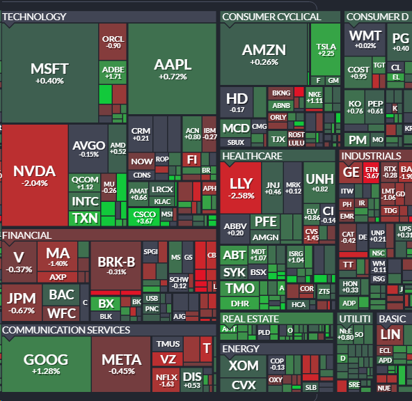 - 장 변화가 크지 않은 가운데 엔비디아(-2.04%)와 일라이릴리(-2.58%)가 크게 하락하며 시장에 부담.