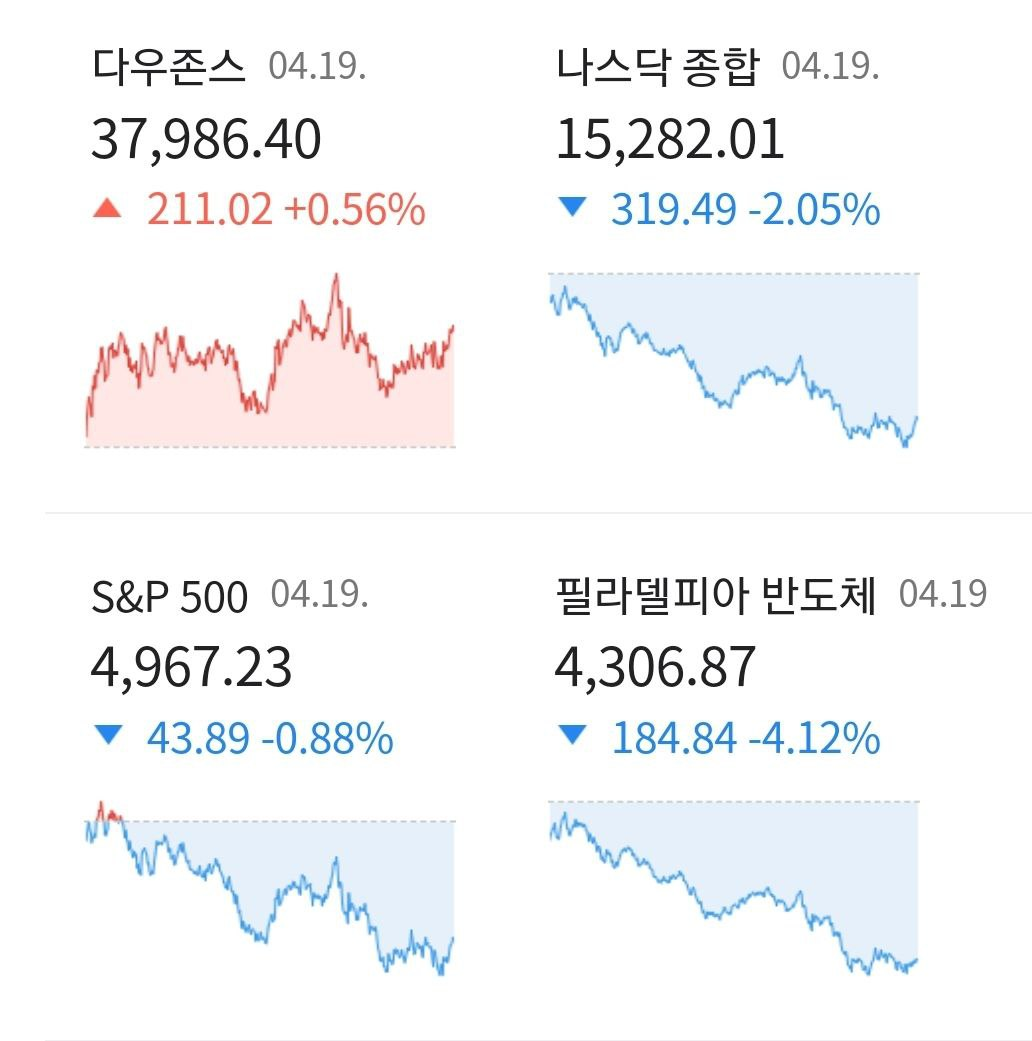 - 주말을 앞두고 안전자산선호와 함께 위험을 회피하려는 심리가 부각되면서 대형 기술주는 일제히 하락했다. 중동 지정학적 불안과 함께 인플레이션 하락 둔화에 미국 연방준비제도(Fed·연준) 금리인하도 여의치 않을 것으로 예상됨에 따라 시장 심리는 위험 회피와 차익 실현으로 크게 기울었다.