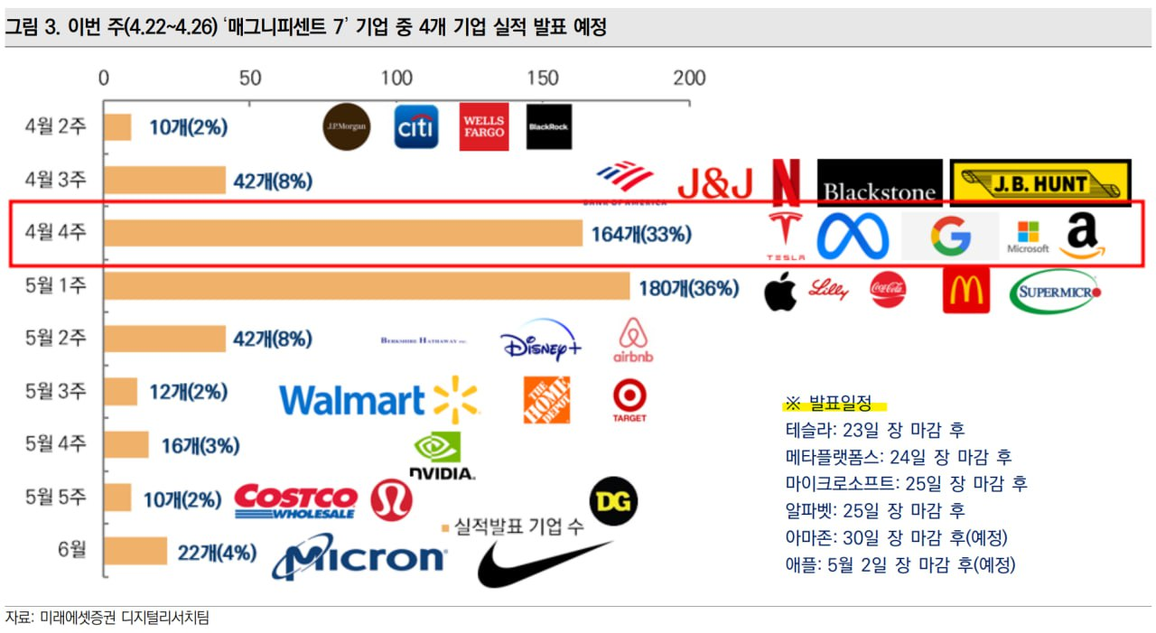 - 때문에 이번 주 메타, 알파벳, MS 등의 실적이 중요. 더불어 25일(목) 인텔의 실적도 중요. 1분기 데이터센터 및 AI 관련 매출이 발표되기에 관련 수요 전망을 알 수 있기 때문.