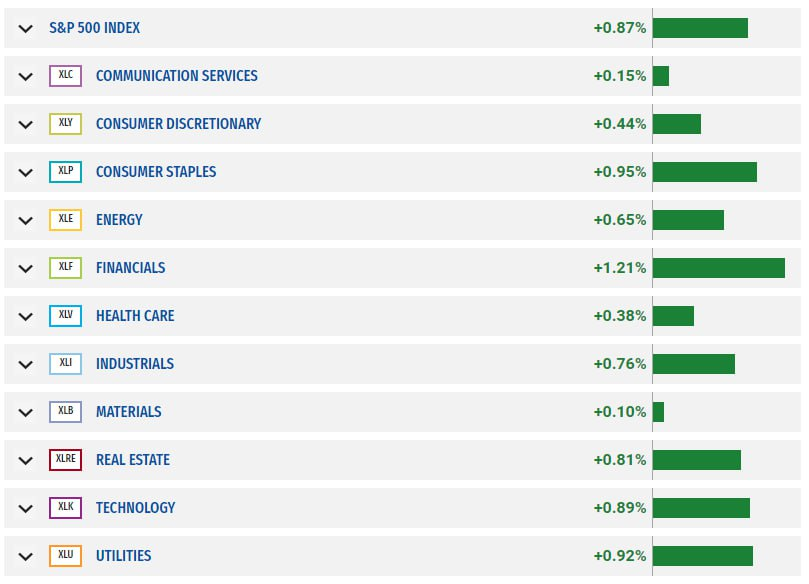 - S&P500 주요 섹터 중 IT(+1.3%), 금융(+1.2%) 등이 1% 넘게 상승하며 전 업종 상승 마감.