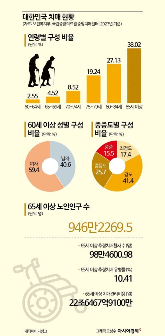4. 치매 비율 75세 이후 습속히 증가 → 전체 치매 환자 중 연령별 비중은 ▷60~64세 2.55% ▷65~69세 4.52% ▷70~74세 8.52% ▷75~79세 19.24% ▷80~84세 27.14% ▷85세 이상 38.02%으로 84.4%가 75세 이상이다.(아시아경제)