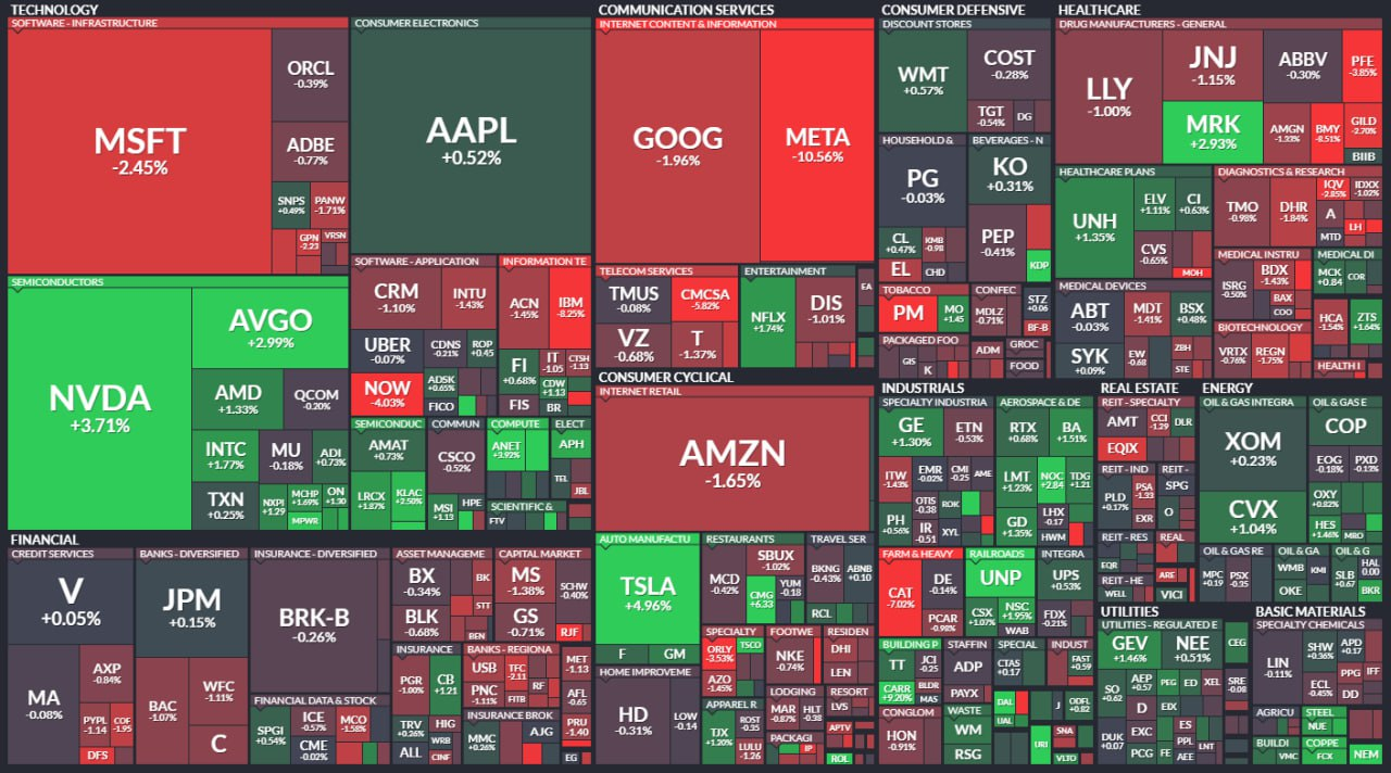 - - 메타 플랫폼즈 $META 호실적에도 불구, 약한 가이던스로 -10% 하락하며 실적 발표를 앞둔 마이크로소프트 $MSFT 알파벳 $GOOG 아마존 $AMZN 등을 끌어내리면서 지수 하락 주도.
