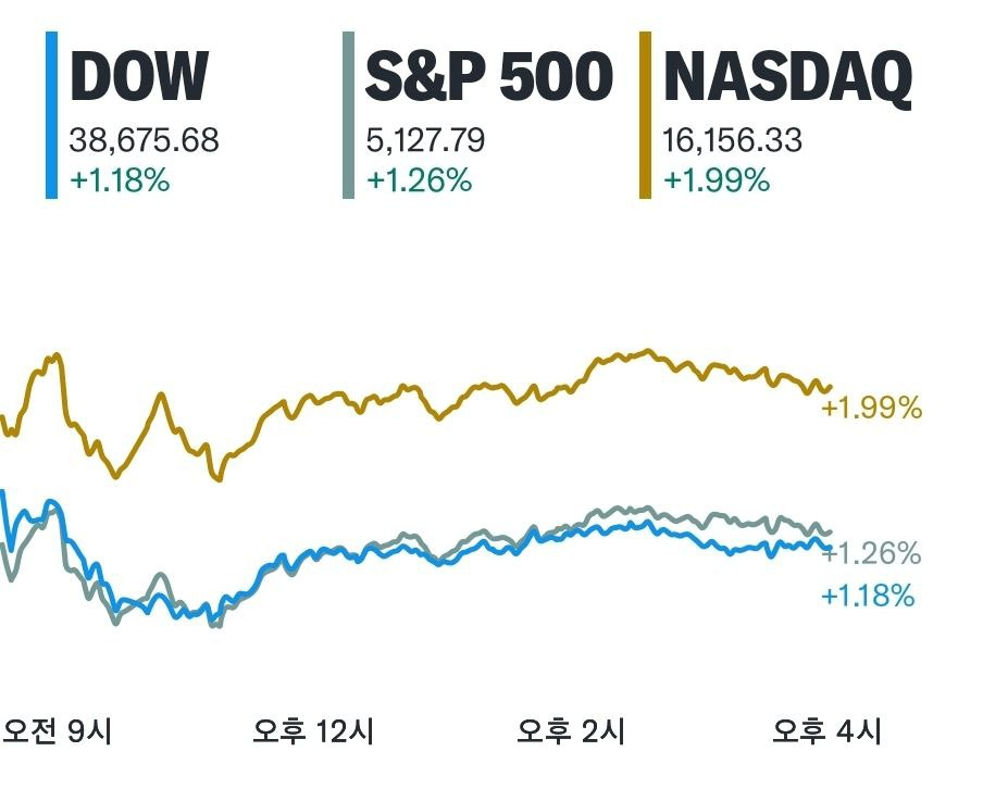 - 다우지수 1.2% 상승, S&P 500 1.3% 상승, 나스닥 2.0% 상승 마감