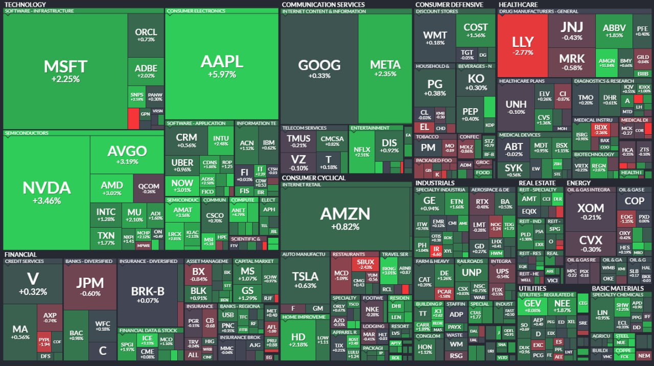 - 전 섹터 상승. 애플 실적 발표 급등하며 기술주 상승 주도. -