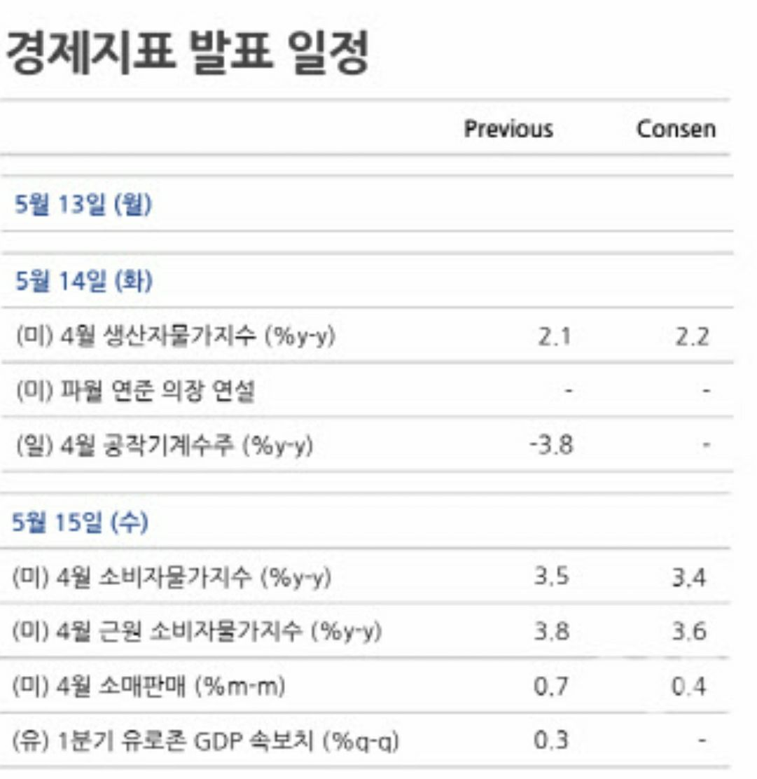 - 이번 주에는 미국의 지난 4월 소비자물가지수(CPI)와 생산자물가지수(PPI)가 발표된다.