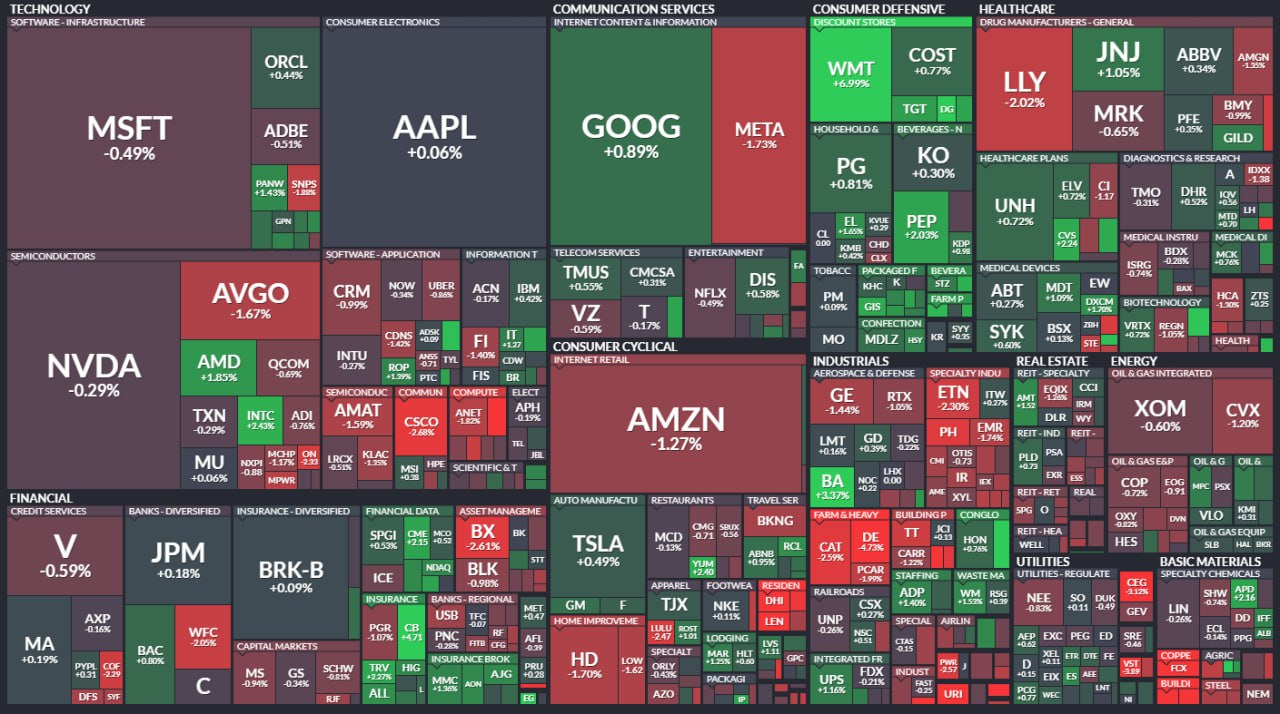 - 블록미디어 소매 대장주 월마트 $WMT 의 호실적과 포스트 CPI 랠리가 지속되며 3대 지수 상승 출발했으나 장막판 매물 출회되며 하락 마감. -