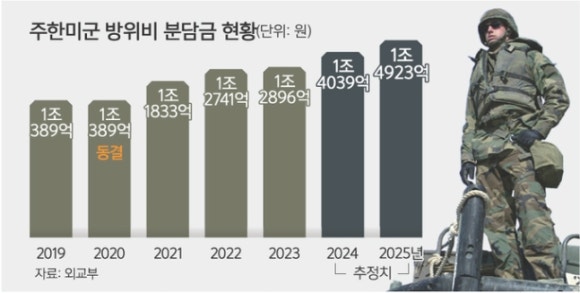 8. 주한 미군 방위비 분담금 → 한국의 분담금을 정하는 연동 기준은 물가상승률에서 2021년부터 한국의 국방비 증가율로 변경되었다. 올해분 분담금 규모는 1조 4천억을 넘어설 전망이다.(세계)