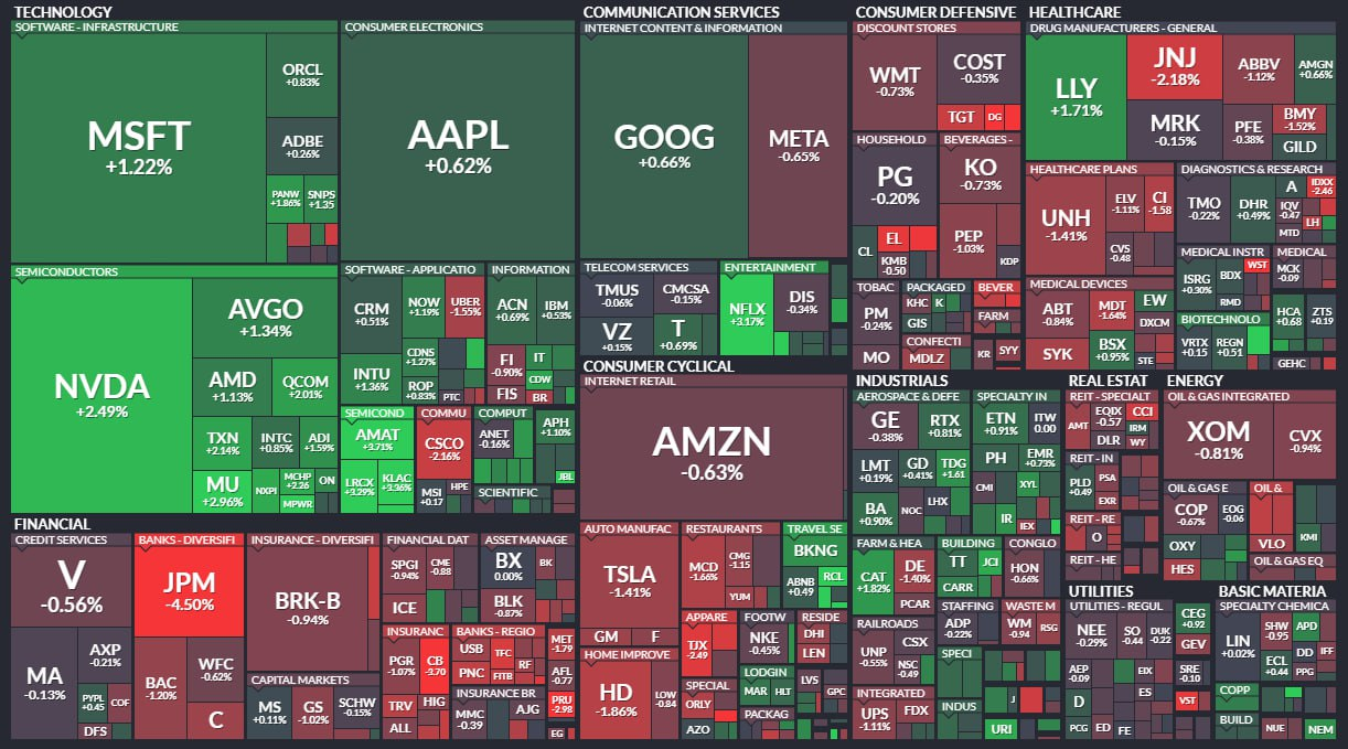 - JP모건 체이스(-4.5%)는 제이미 다이먼 CEO가 향후 5년 내 은퇴할 것이란 점과 자사주 매입 기대감 약화에 하락.