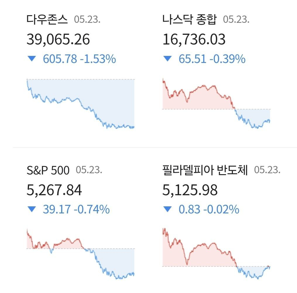 - 5/24 미 증시, 엔비디아 제외 광범위한 차익실현에 하락