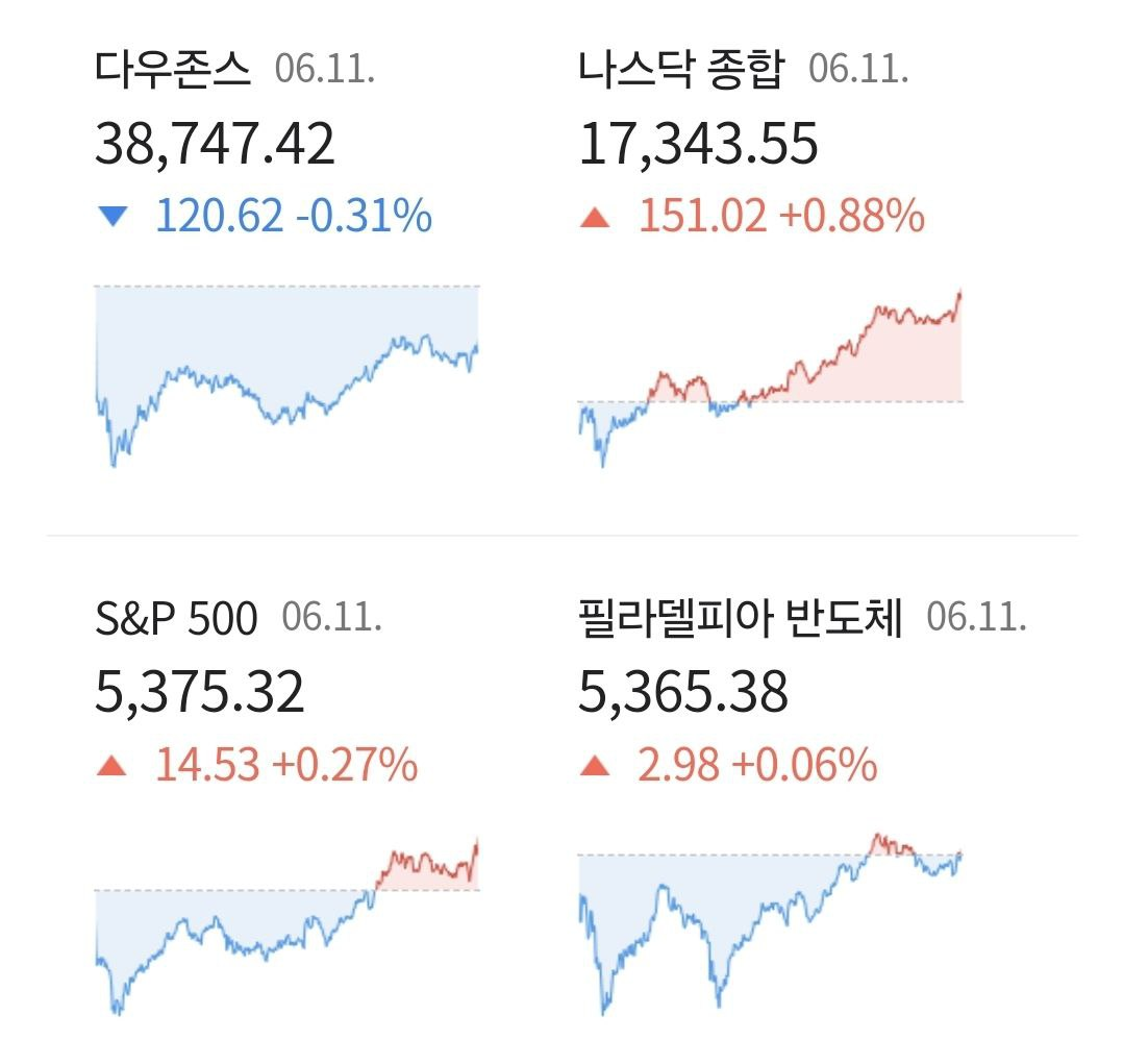 - 06/12 나스닥, 애플의 급등과 금리 하락 속 상승 전환 후 폭이 확대