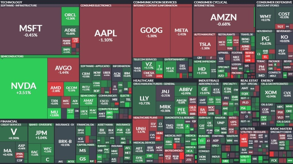 - 매7 중 엔비디아 $NVDA 를 제외한 나머지 종목 모두 하락. 그러나 나머지 S&P 493 이 강세를 보이며 최근 좁아진 마켓 폭이 모처럼 확장된 하루. 매7이 주로 포진한 커뮤니케이션 서비스, 임의 소비재 섹터가 약세를 보였으며 기술 섹터는 애플 $AAPL 과 마소 $MSFT 가 소폭 하락했지만 엔비디아가 큰 폭으로 상승하며 소폭 상승.