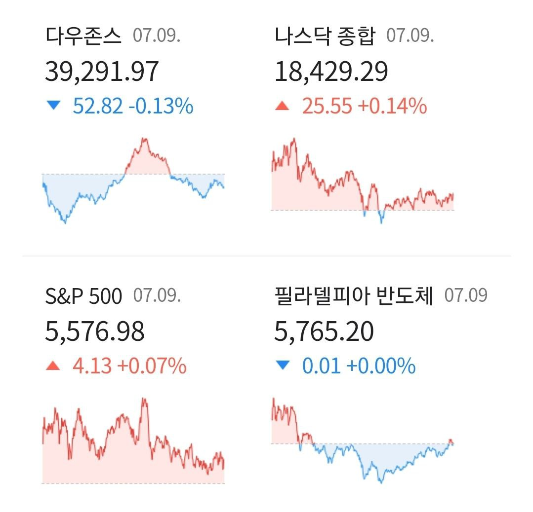 - 다우지수 제외 일제히 상승 - 다우지수 0.1% 하락, S&P 500 0.1% 상승, 나스닥은 0.1% 상승.