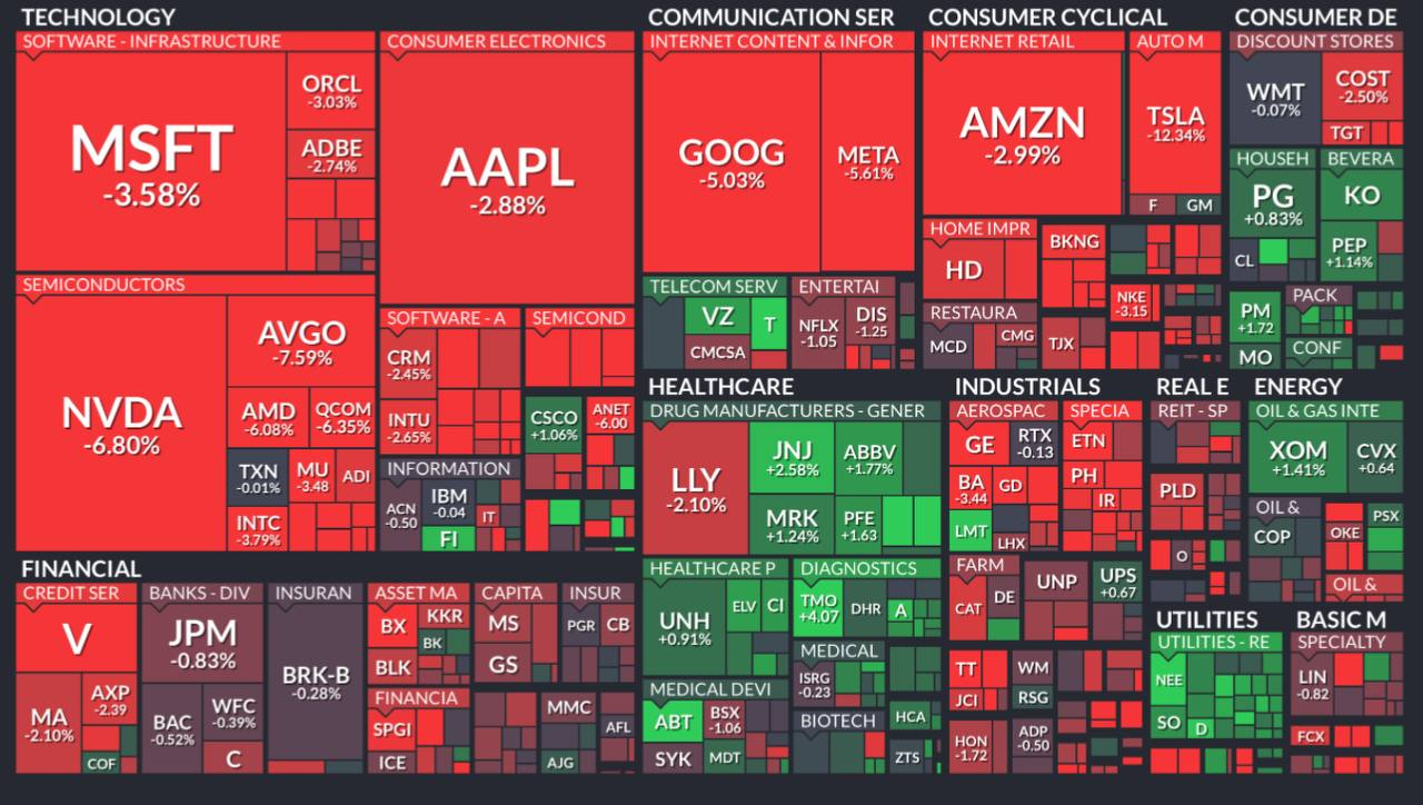 - 매7 전 종목이 -2% 이상 하락했으며 테슬라 $TSLA -12%, 엔비디아 $NVDA -6.8%, 알파벳 $GOOG -5% 하락하며 시장 하락 주도.
