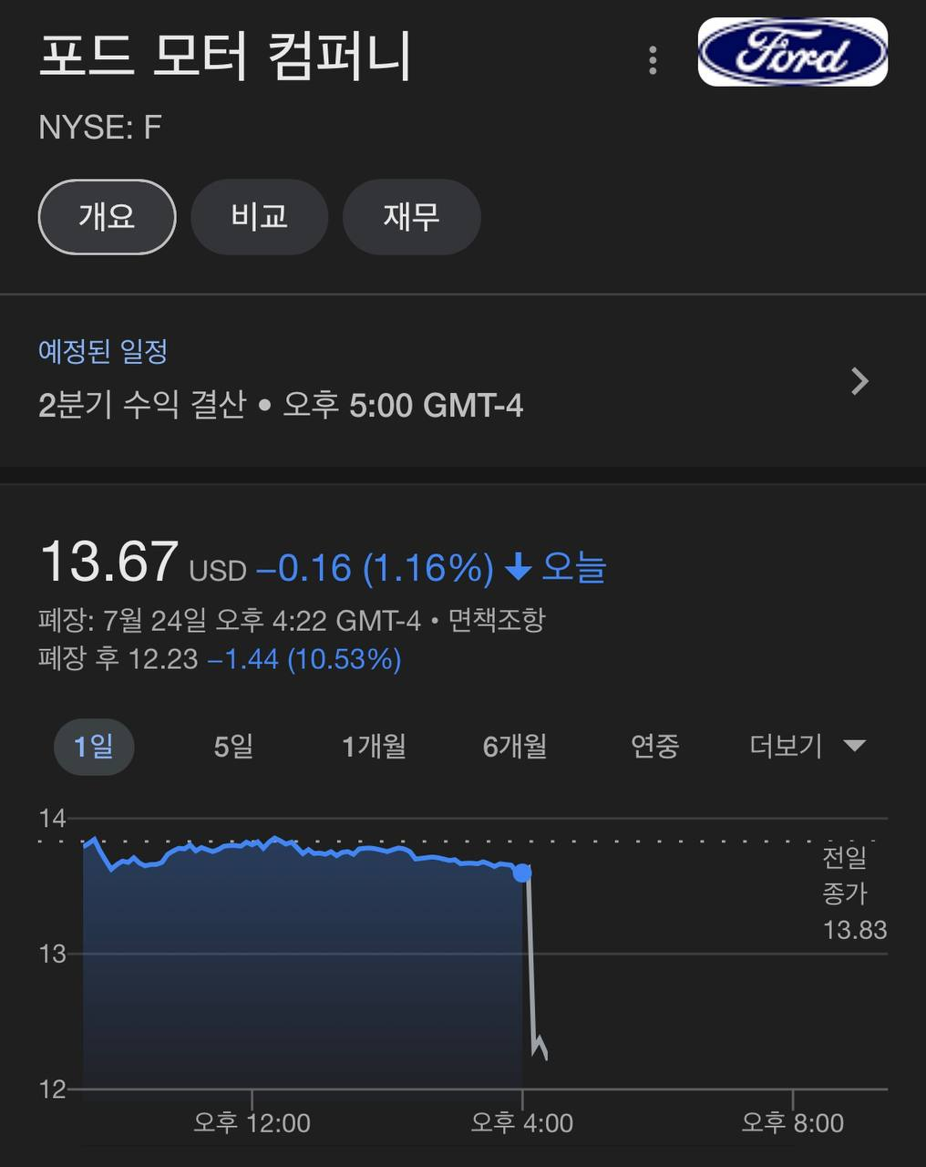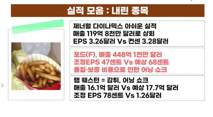 - 포드(-1.16%)는 예상보다 부진한 실적과 가이던스 발표하며 10% 하락 중