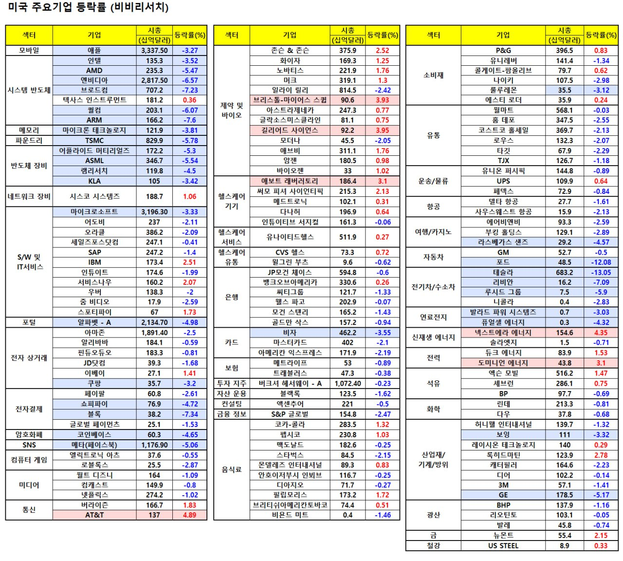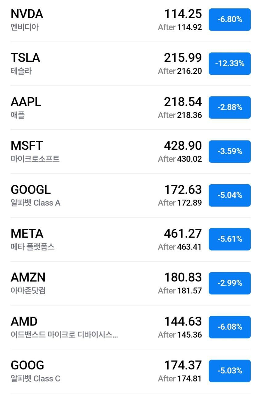 - 테슬라 -12%, 알파벳 -5%, 엔비디아 -6.8%, 메타 .5.6%