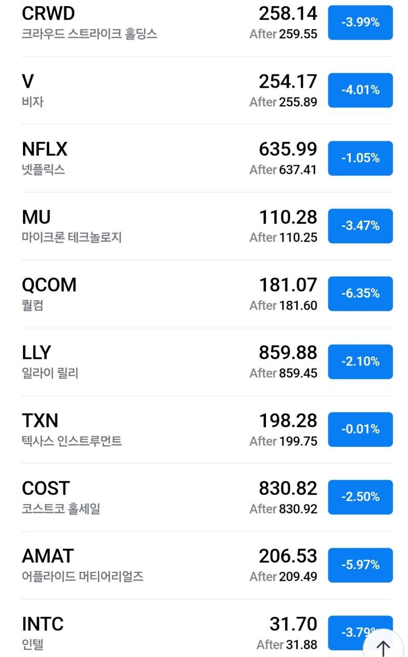 - 엔비디아(-6.80%)는 AI 산업에 대한 투자 증가가 약화될 수 있다는 우려를 반영하며 하락.