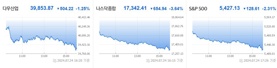 - 이는 그동안 AI 산업 관련 투자를 확대해 왔던 MS(-3.59%), AI 모델인 Llama 무료 버전을 발표한 메타 플랫폼(-5.61%), 아마존(-2.99%), 애플(-2.88%)등 대형 기술주도 하락폭이 확대.