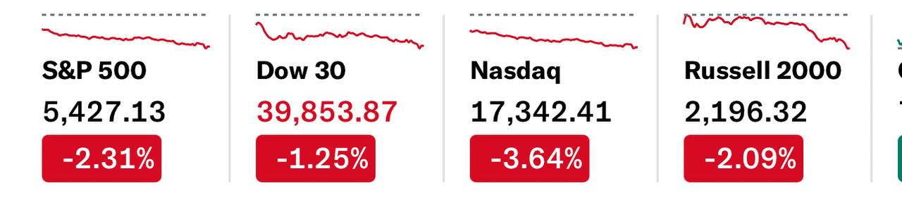 - - 다우지수 1.2% 하락, S&P 500 2.3% 하락, 나스닥은 3.6% 하락.