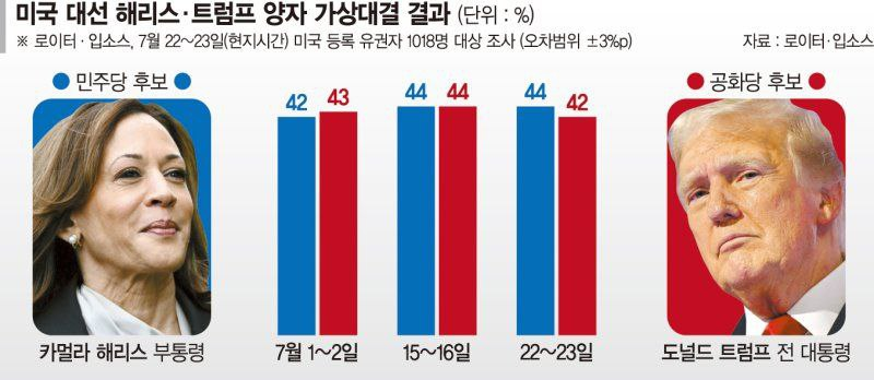 - 1면 : 처음으로 뒤집혔다…‘상승’ 해리스 44% vs ‘주춤’ 트럼프 42%