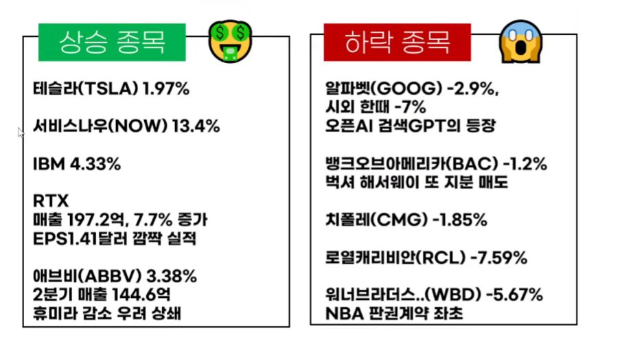 - Ford는 비용 증가로 인한 부진한 실적 영향으로 18.40% 하락함. IBM은 AI와 소프트웨어 사업 분야에서 호조를 보이며 예상치를 상회하는 실적을 발표하며 주가가 4.36% 상승 마감함.