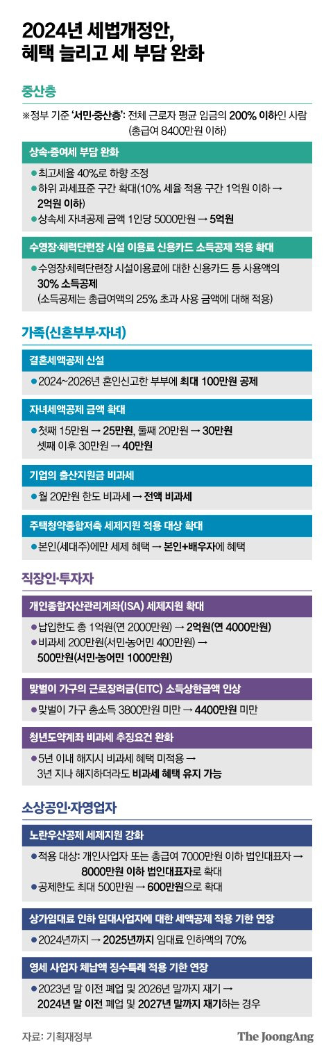 2. 세법상 ‘서민-중산층’ → 이번 상속세 개편안에서 ‘서민-중산층’ 기준을 전체 급여근로자 평균임금의 200%까지(총급여 8400만원 이하)로 정하고 각종 세금 조항을 정비 적용.(중앙)▼