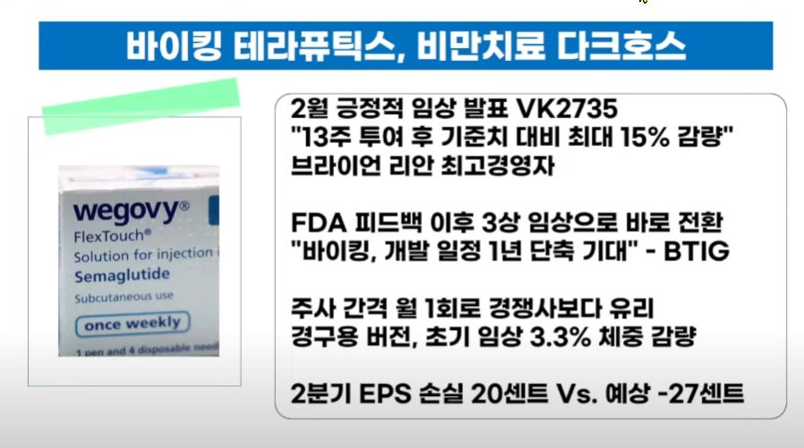 - 일라이릴리(-4.50%)와 노보노디스크(-2.84%)등 체중감량 관련 제약회사들은 바이킹 테라퓨틱스(+28.31%)가 자사의 체중감량 약물 임상 시험 후반 단계에 진입했다고 발표하자 하락.