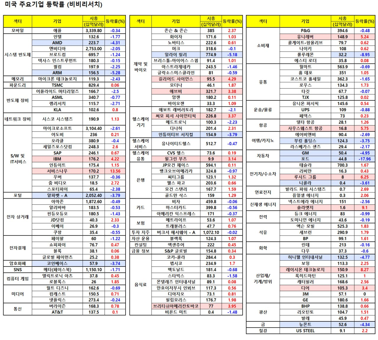 - 시게이트(-5.09%), 웨스턴디지털(-7.67%)등 컴퓨터 하드웨어 업종은 마이크론(-2.57%)과 함께 2분기 PC 출하량 감소 소식에 매물 출회 지속되며 하락.