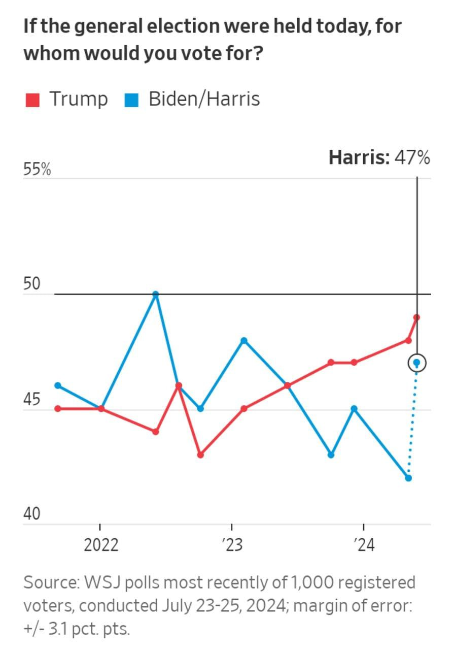 - 26일(현지시간) 월스트리트저널(WSJ)은 자체 여론조사 결과 가상 양자대결에서는 트럼프 전 대통령이 49%대 47%로 앞섰지만, 로버트 F 케네디 주니어가 낀 삼자대결에서는 해리스가 45%, 트럼프가 44%로 역전이 이뤄졌다고 전했다.