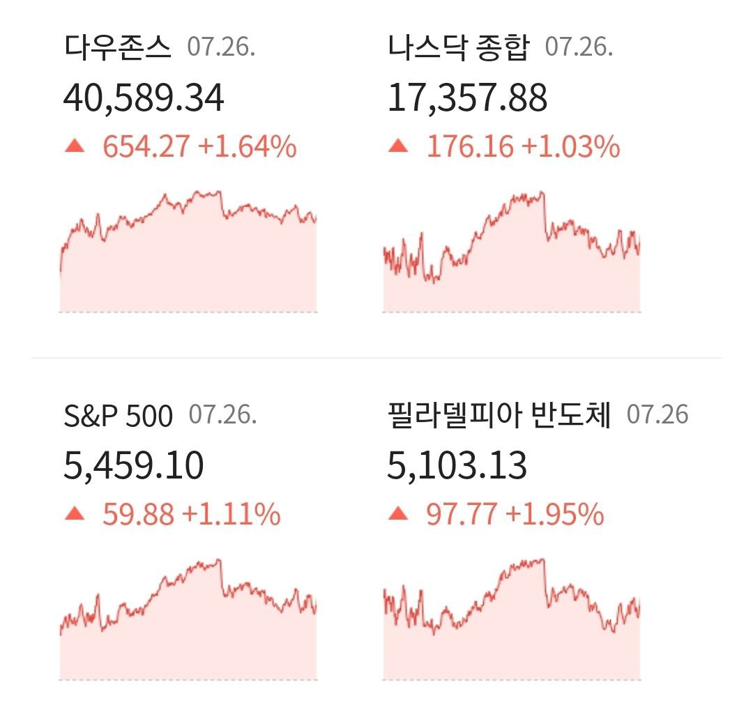 - 과매도에 따른 보상 심리와 전날 2분기 GDP 성장률 강세에 이어 미 연방준비제도(Fed)의 통화정책을 바꿀 긍정적 물가지표가 나오면서 투자 심리가 살아났다.