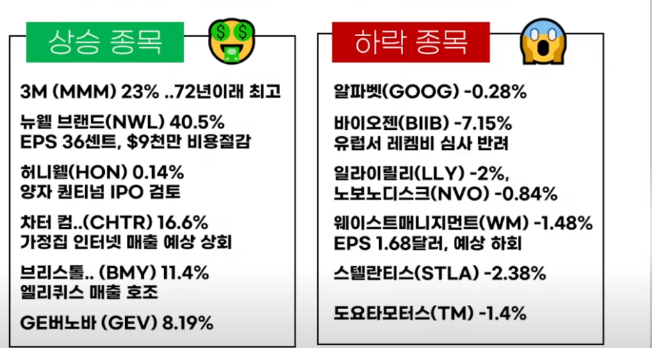 - 다우지수 구성 종목 중 하나인 3M(+22.99%)이 주요 부문 대부분 예상을 상회한 실적을 발표하자 급등.