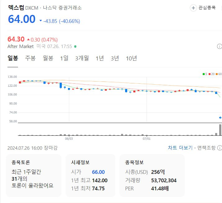 - 의료 기기 업체인 덱스컴(-40.66%)은 예상보다 부진한 실적과 함께 올해 전망도 하향 조정하자 급락.
