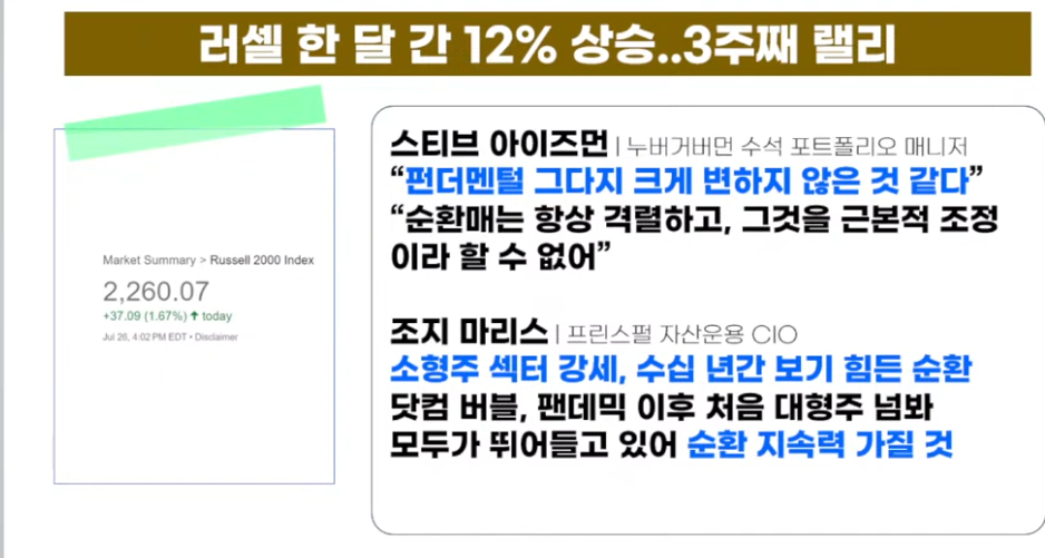 - 금리 인하가 임박했다는 전망이 나오면서 그동안 주가가 크게 오른 주도주에 비해 소외되었던 저평가 종목에 대한 매력도가 높아지고 있다는 분석이 제기됨.