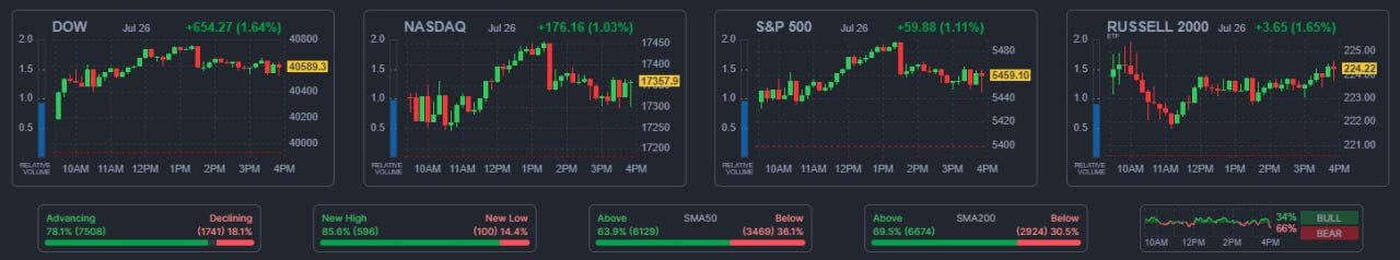 - 매7과 기술주 반등하며 3대 지수 + 러셀 2000 상승.